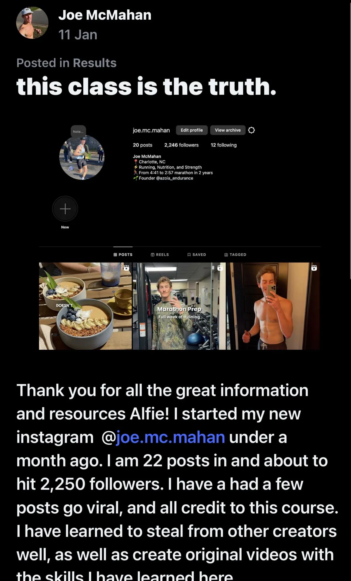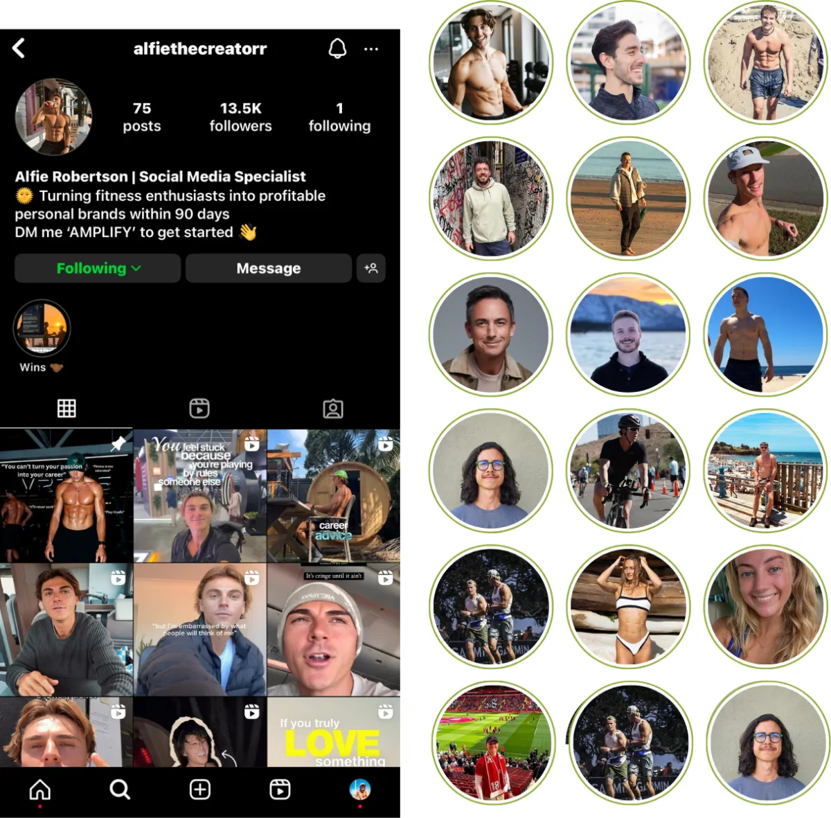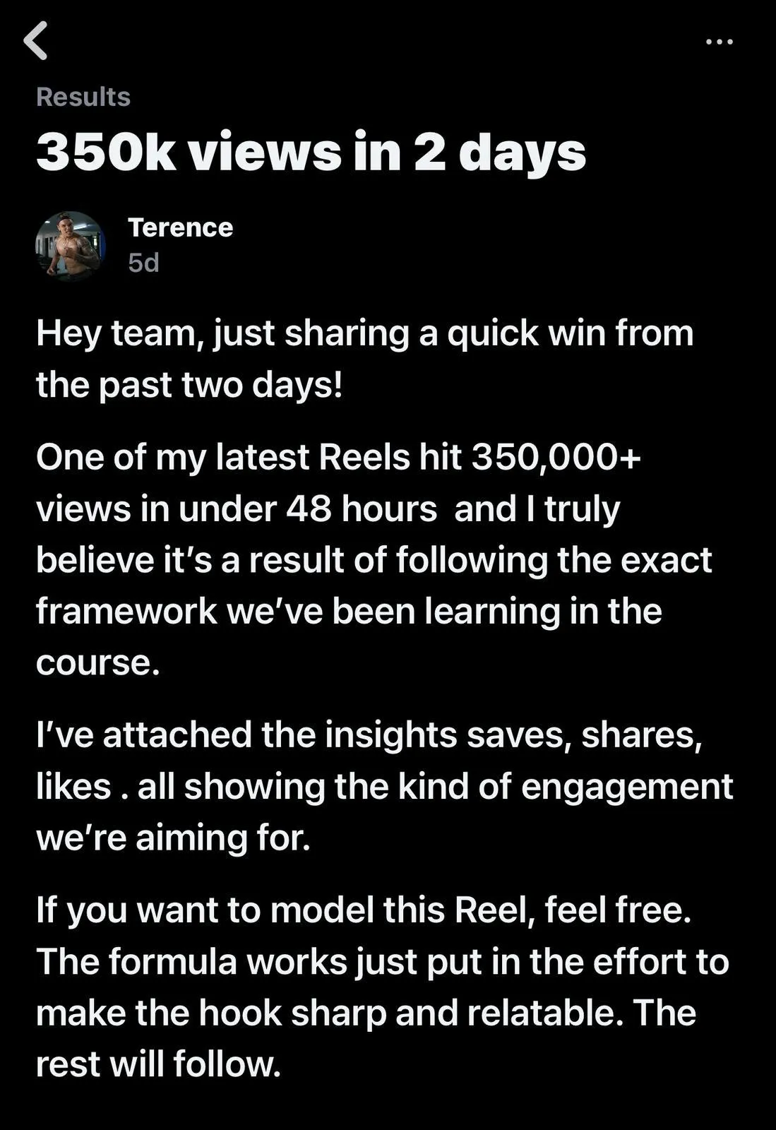 Utilizando las plantillas de contenido y los marcos virales de Amplify, sumó 120 000 seguidores en 60 días y reestructuró su oferta en un modelo escalable que mejor se adaptaba a su audiencia.