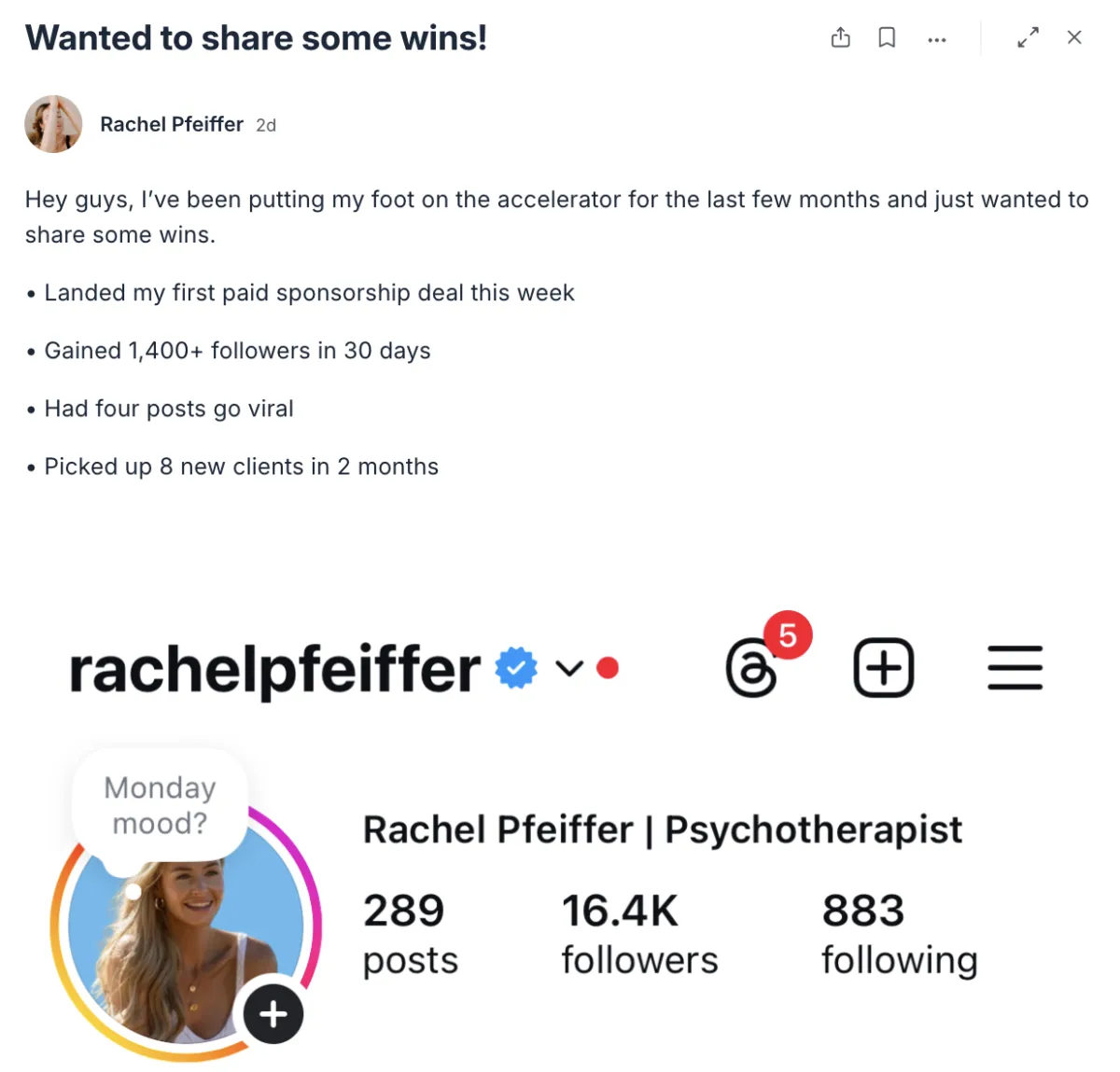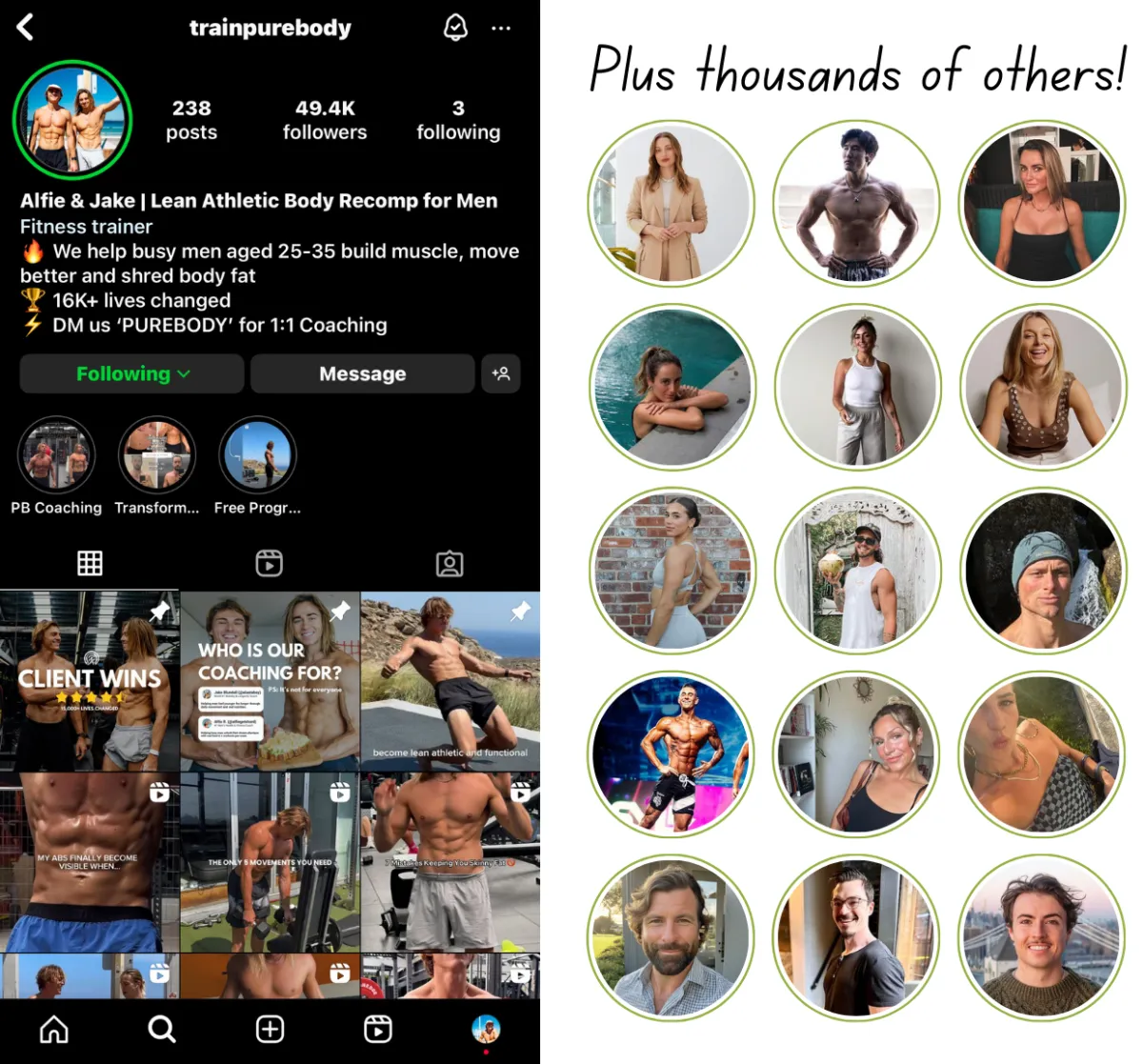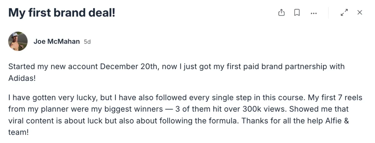 Utilizando las plantillas de contenido y los marcos virales de Amplify, sumó 120 000 seguidores en 60 días y reestructuró su oferta en un modelo escalable que mejor se adaptaba a su audiencia.