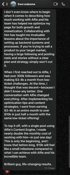 Estructuró su oferta de coaching para conectar con su audiencia, perfeccionó su contenido para atraer clientes potenciales listos para comprar y creó un sistema de ventas y mensajes directos repetible que continúa atrayendo clientes de alto valor.