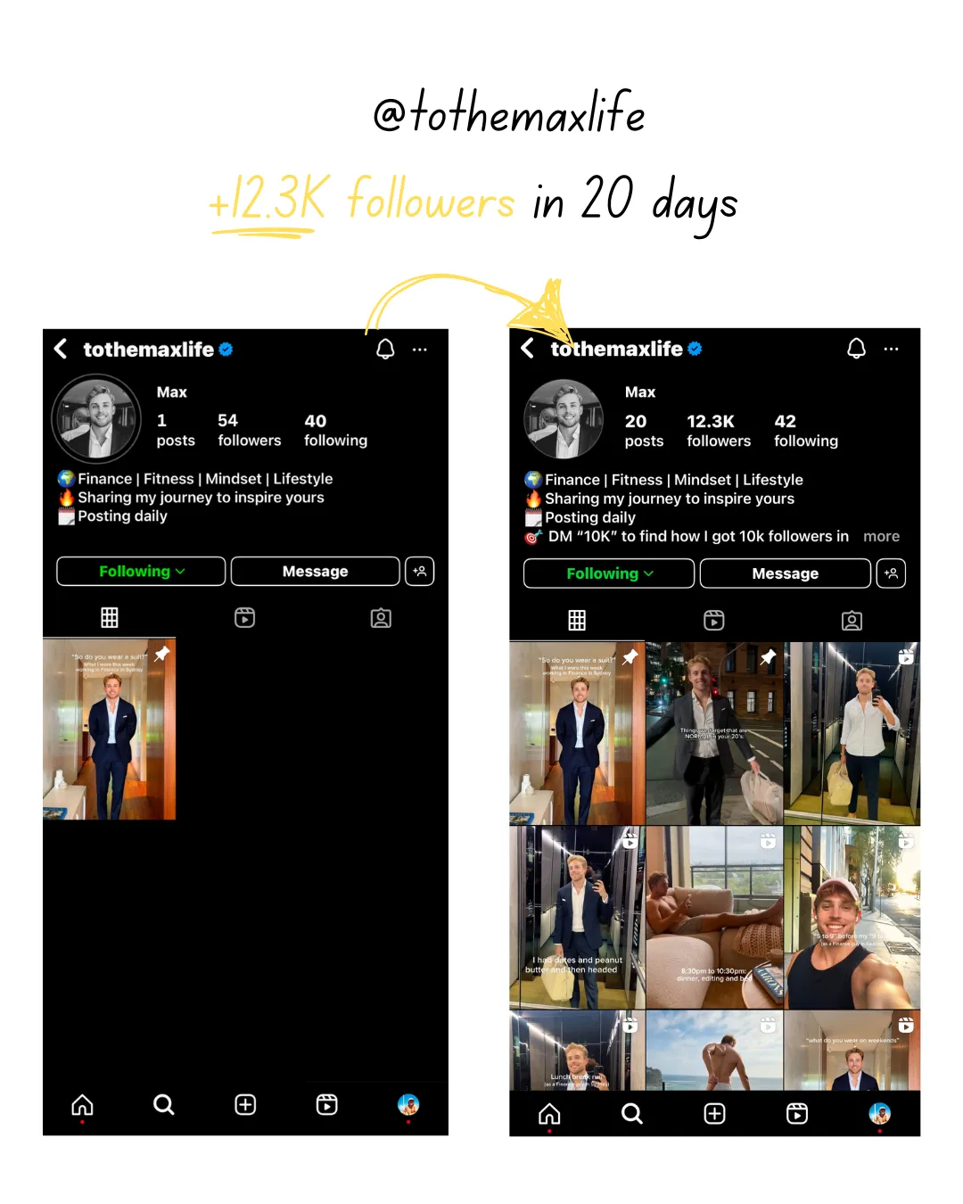En tan solo 20 días, Max pasó de 0 a 12.3 mil seguidores y generó $30 mil en ventas de alta gama directamente desde su marca personal.